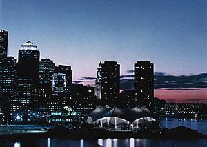 Located on Boston's Fan Pier, adjacent to Rowes Wharf, this seasonal amphitheater for 4,500 seats is designed for easy assembly in the spring and dismantling in the fall. The high profile of the roof allows spectators to take in panoramic views of the Boston skyline and provides the height needed for sound and lighting equipment behind the stage.