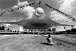 This completely customized, mechanized tensile pavilion is erected from a set of custom-designed tractor trailer beds and their contents. When loaded, the vehicles comply with federal highway regulations. Once on-site they are opened up and unfolded to create a stage large enough for full orchestra and chorus. A fabric canopy with lighting and video projection screen is supported by a steel truss pyramid. Numerous battery-powered, robot-like speaker towers distribute concert sounds to summer picnickers.