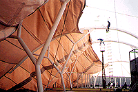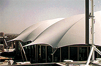 A Teflon coated glass fiber fabric membrane provides the main roofing element. It is supported by steel arches. A glass based liner provides an internal "second skin" that improves the air-conditioning efficiency of the fabric roof.