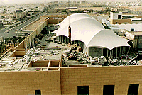 The curved shapes of the double-skin tensioned fabric roof structure and glass exterior walls set a relaxed mood which contrasts with the rectangular geometry of the Ministry building below. The roof form also recalls the shapes of traditional Bedouin tents of the Arabian peninsula.